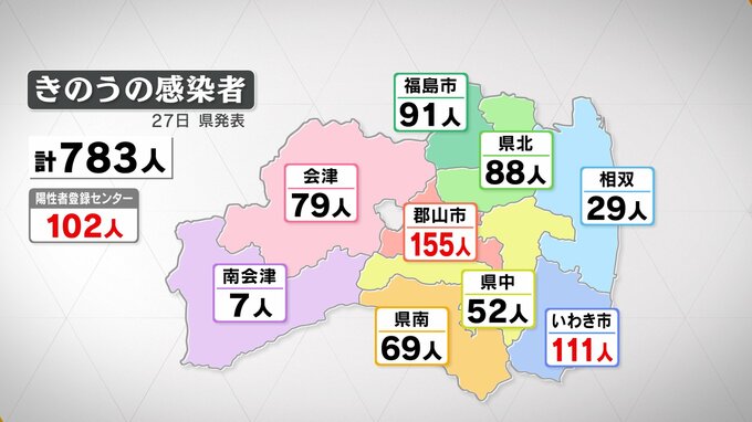 新型コロナウイルスについて、26日、福島県内では783人の感染が確認されました。感染者数は、27日から保健所単位の発表に変更されました。【内訳】9保健所と陽性者登録センター福島市 91人郡山市 155人いわき市 …