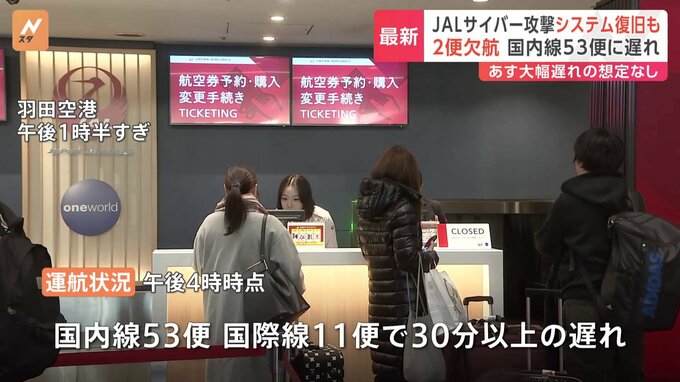 日本航空のネットワークがサイバー攻撃を受け、システムに不具合が出ていた問題です。午後にはすべてのシステムが復旧しましたが、きょうの便に欠航も出ています。日本航空によりますと、きょう午前7時半ごろから…