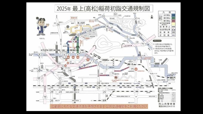 岡山県警は、岡山市北区の最上稲荷の初詣に向かう車の交通規制図を発表しました。