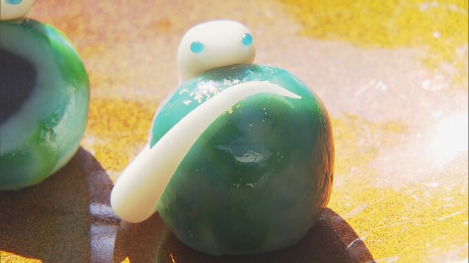 豊橋市の和菓子店「お亀堂」が販売している来年の干支和菓子です。寒天に砂糖を加えて煮詰めることで、鮮やかな青緑色に仕上げ、中にはこしあんが入っています。