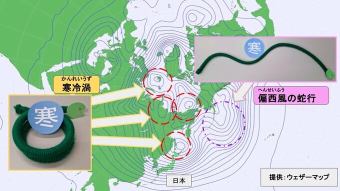 「蛇行するヘビ」=「偏西風」とは地球の周りを西から東へ向かって吹いている風のことです。この偏西風が日本付近で南に蛇行すると、日本付近に寒気が流れ込みやすくなり、大雪や低温の原因になるのです。