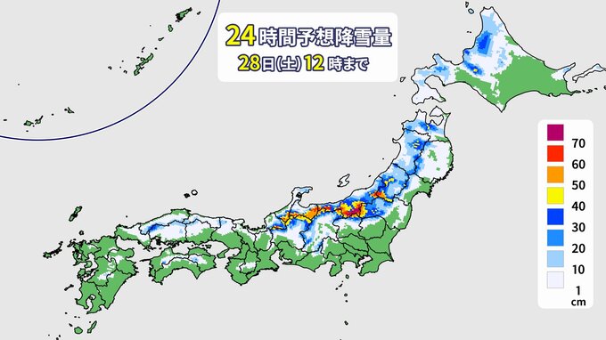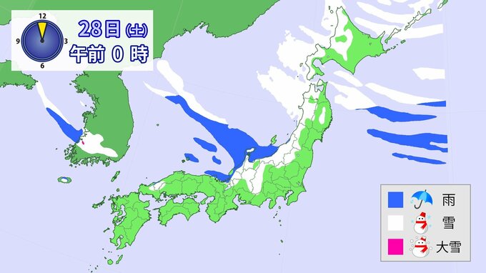 28日~29日は、一段と寒気の流れ込みが強まり、広い範囲で雪や冷たい雨となるでしょう。