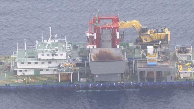 地盤改良工事に向け、27日午後5時過ぎには大浦湾の沖合でくい打ちに先駆けて海底に砂を沈め平らにするための船「トレミー船」が確認されました。