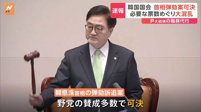 韓国の国会が大混乱です。「原則、無効だ。原則、無効だ」韓国の国会で先ほど、尹錫悦大統領の職務を代行する韓悳洙首相に対する弾劾訴追案の採決が行われました。可決に必要な票数をめぐり与野党の主張が分かれる…