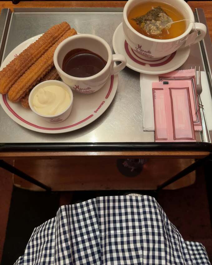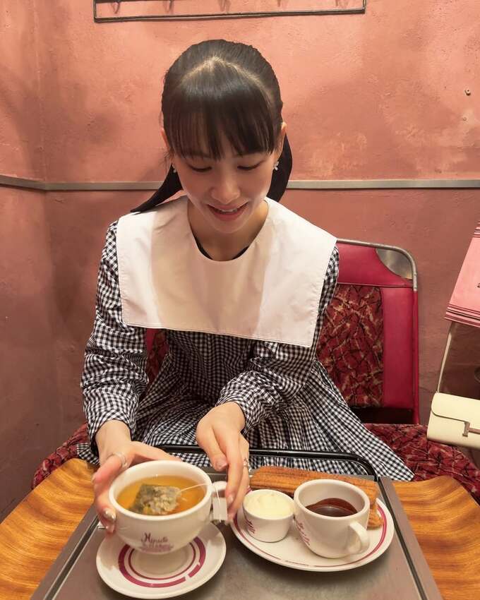 あ~ちゃんは、韓国・ソウルの有名店「Minute Papillon」での写真を投稿。テーブルに置かれたトレイには、ハーブティと思われるマグカップに、チョコとホワイトの2種類のクリームのカップを添えたチュロスが並べてあります。
