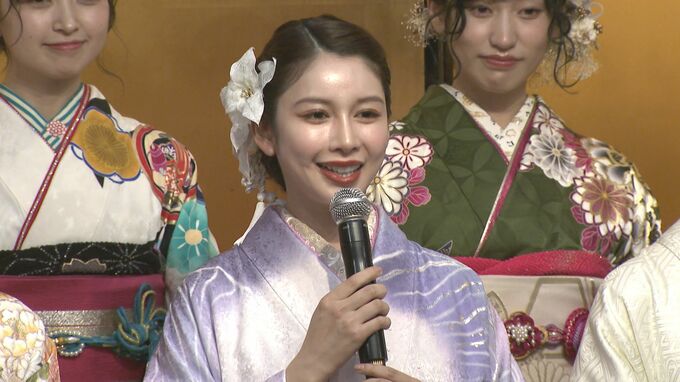 薄紫で鮮やかな晴れ着を着た結城さんは、2024年を振り返って ”私が初めて主演を務めた「乱歩の幻影」が無事に公開できました。出身の福岡で舞台挨拶することができたことが大切な思い出になりました”と話し、”2025年は、尊敬する大先輩との共演が決まっていますので、成長した姿を見せることができるように努力したい”と今年の抱負を語りました。