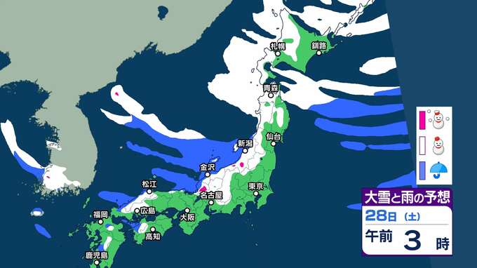 【大雪情報】雪は降る…いつ?どこで?新潟県80センチ、富山県50センチ…北陸は “警報級の大雪” のおそれ 帰省時には交通障害に注意【1日までのシミュレーション 3時間ごと】土日はJPCZで大雪警戒 東京など晴れる所も極寒に チューリップテレビ 2024年12月27日(金) 22:21 国内 天気 28日 大雪と雨のシミュレーション 次に年末年始(1日)までの大雪と雨の動きをシミュレーション画像で見ていきましょう。