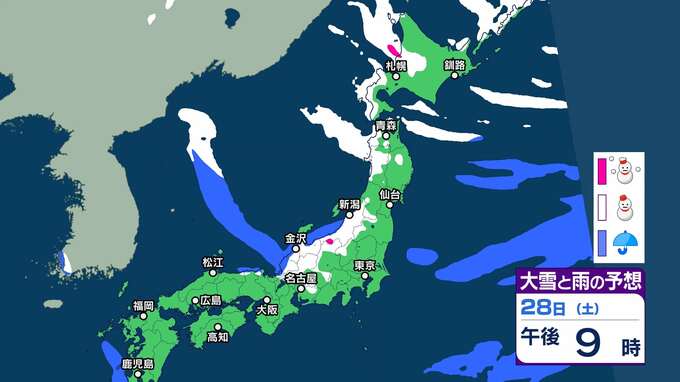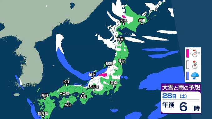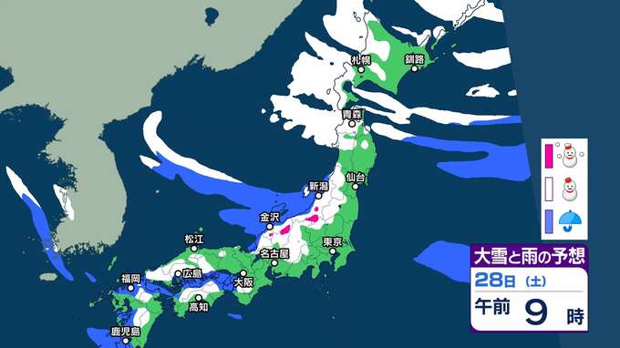【大雪情報】JPCZで大雪警戒 24時間でどれくらい降る?北陸70㎝ 東海60㎝ 北海道・関東甲信・近畿50㎝ 東北40㎝【1日までのシミュレーション】大雪による交通障害に注意・警戒 チューリップテレビ 2024年12月28日(土) 11:00 国内 天気 大雪と雨のシミュレーション 28日(土) 次に年末年始(1日)までの大雪と雨の動きをシミュレーション画像で見ていきましょう。