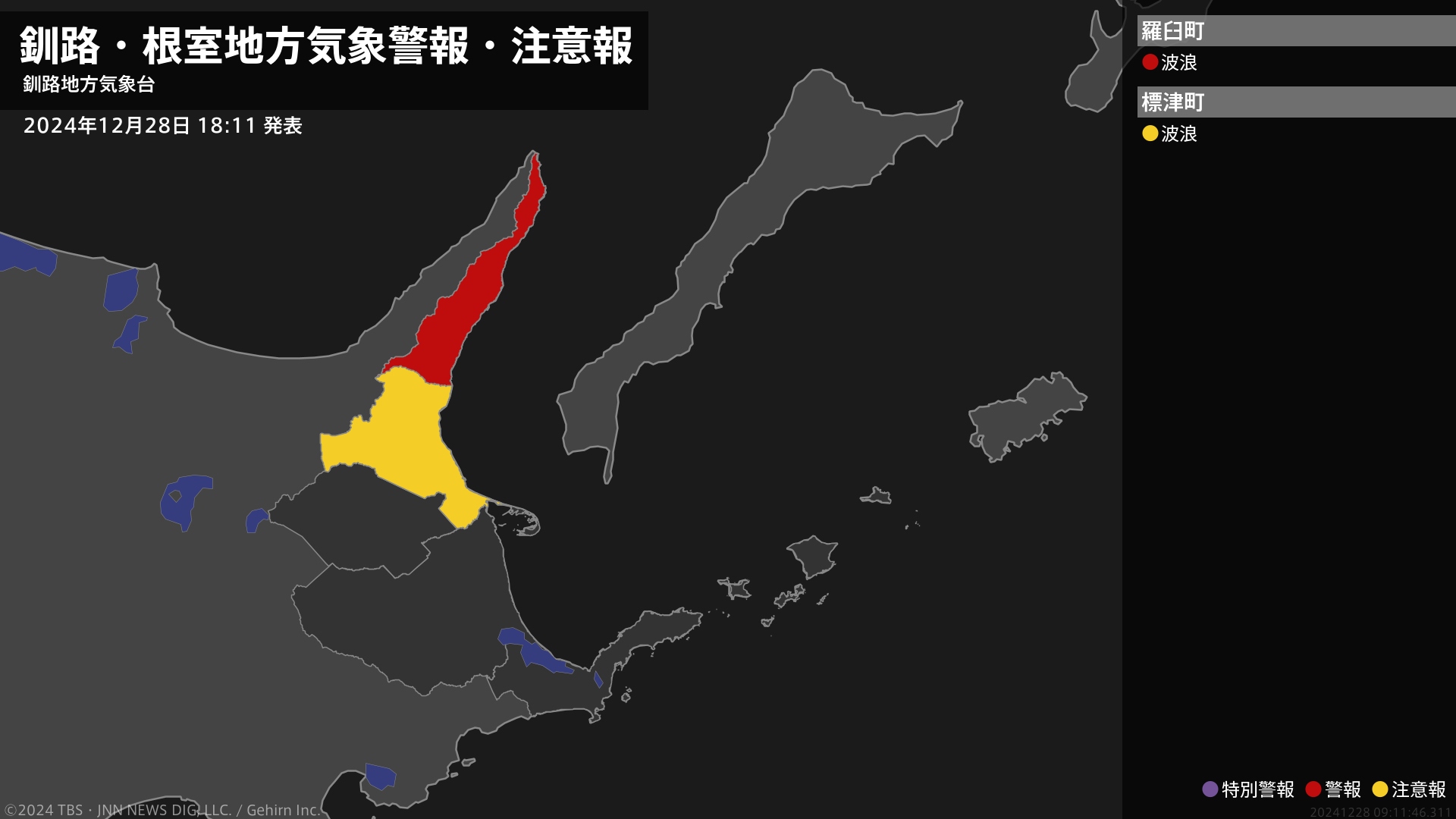 【波浪警報】北海道・羅臼町に発表 TBSテレビ 2024年12月28日(土) 18:11 地震・災害 気象台は、午後6時11分に、波浪警報を羅臼町に発表しました。根室地方では、29日明け方まで高波に警戒してください。【警報(発表中)と予報値】■羅臼町□波浪警報【発表】 29日明け方にかけて警戒・知床岬沖 予想最大波高 6m