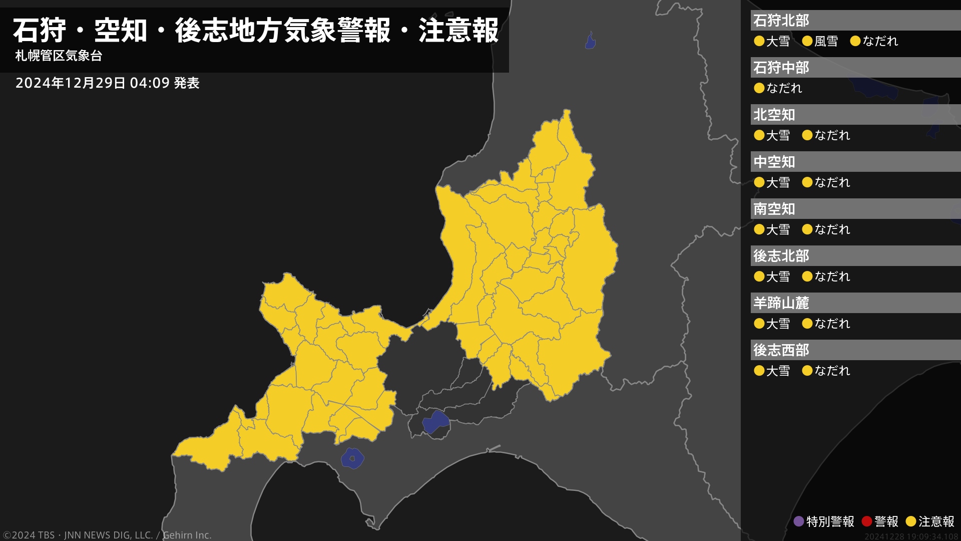 気象台は、午前4時9分に、なだれ注意報を小樽市、積丹町、古平町、仁木町、余市町、赤井川村に発表しました。