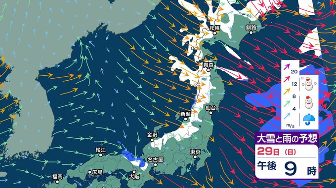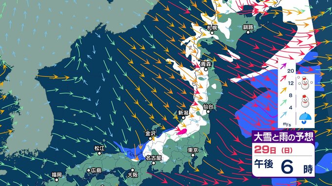 【初日の出 予想】2025年元旦は太平洋側が広く晴れ “寒さ対策” 万全に…一方日本海側は広く雪 “山間部は吹雪の所も”【雪と雨のシミュレーション 2日まで3時間ごと】 チューリップテレビ 2024年12月29日(日) 16:00 国内 天気 29日大雪雨シミュレーション(3時間ごと) 次に年末年始(1月2日)までの大雪と雨の動きをシミュレーション画像で見ていきましょう。