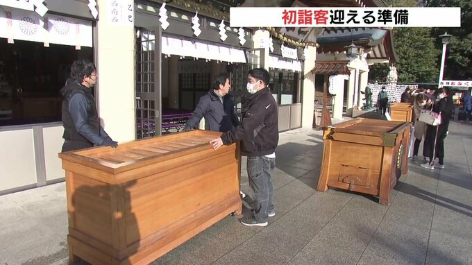 広島市中区の広島護国神社です。正月を前に、賽銭箱を一列に置いたり、鏡開きに使われるたる酒を運んだりしていました。