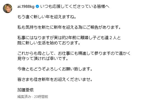 加護さんは「もう直ぐ新しい年を迎えますね。私も気持ちを新たに新年を迎える為にご報告があります。」と書き出し、「私事にはなりますが実は約2年前に離婚し子ども達2人と既に新しい生活を始めております。」と離婚していたこと知らせました。