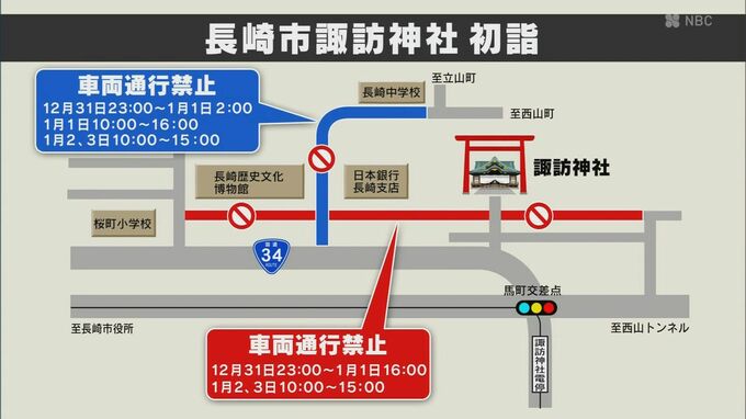 長崎県警では31日から正月3が日にかけて初詣客で賑わう神社の周辺など県内20か所で交通規制を行います。長崎市の諏訪神社周辺の道路では31日、午後11時から正月3が日にかけて一部の時間帯を除き車の通行ができなく…