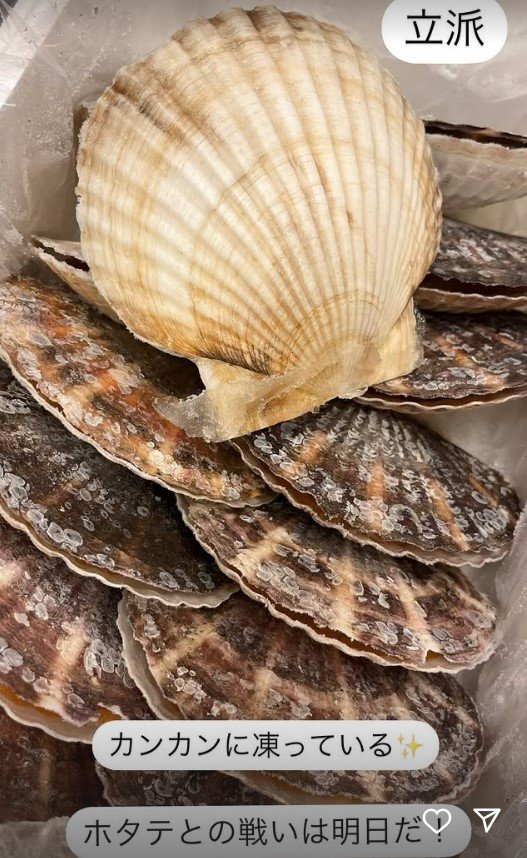 続けて、見事なホタテが並んだ写真をアップし、「カンカンに凍っている ホタテとの戦いは明日だ!」と、綴ると「見て!おっきぃ!!!!!!!」と、美味しそうな貝柱の画像を投稿。