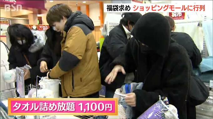 恒例のタオル詰め放題も賑わい、買い物客は腕がパンパンになるまで力を込めてタオルを押し込んでいました。