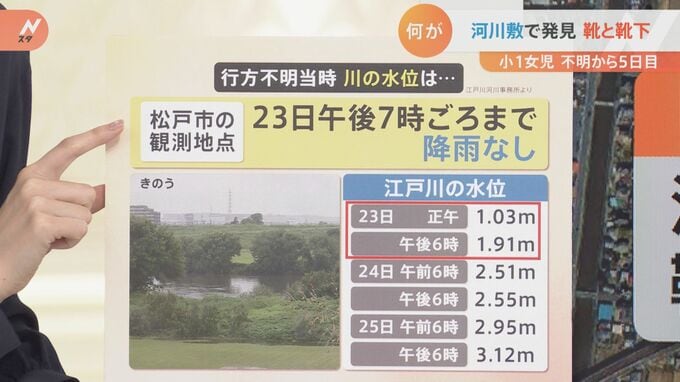 松戸市では、朝芽さんがいなくなった23日午後7時ごろまで雨は降っていませんでした。ですので、普段このあたりの江戸川の推移は1mくらいから2m台前半ほどということで
