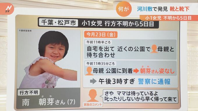 小1女児 南朝芽さん(7歳)の行方不明から5日が経ちました。9月23日(金)に自宅を出て近くの公園で母親と待ち合わせをしようとしていました。母親が公園に到着した時には、朝芽さんの姿はありませんでした。河川敷を中心に120人態勢で捜索は続いています。