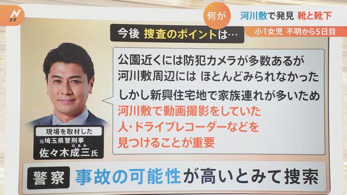 「公園近くには防犯カメラが多数あるが、河川敷周辺にはほとんどみられなかった。しかし、新興住宅地で家族連れが多いため河川敷で動画撮影をしていた人・ドライブレコーダーなどを見つけ、そこから情報が得られるのではないか」ということです。