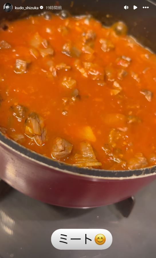 工藤さんは、鍋に玉ねぎや、賽の目に切った牛肉と思われる食材を鍋で熱した後に、トマトソースを注ぎ込む動画を投稿。その鍋で食材が赤く煮込まれている動画を続けて投稿し、笑顔の絵文字と共に「ミート」とテキストを添えています。