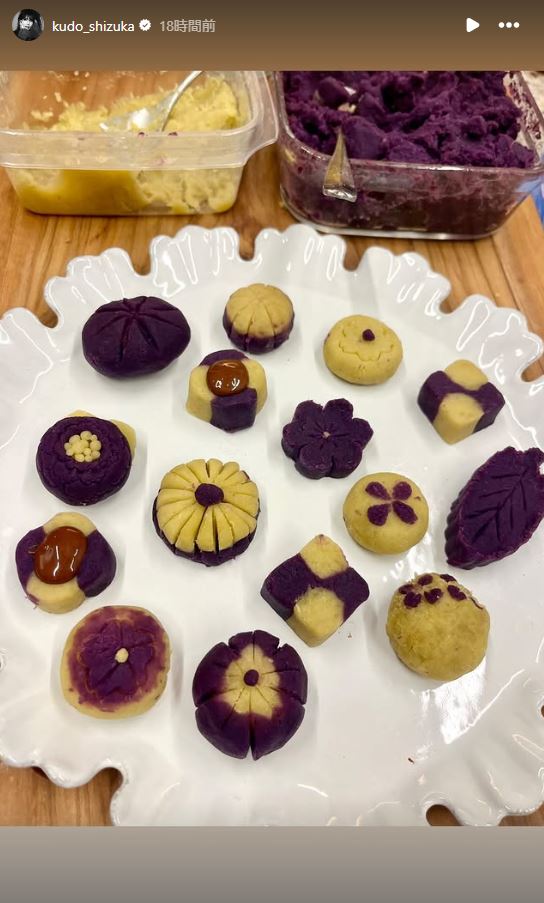 続いて工藤さんは、きんとんや紫いもと思われるペーストを練り固めて、オリジナルのお菓子をお皿に並べている写真を投稿。どれも細かな花模様となっていて、手がかかっていることがうかがえます。
