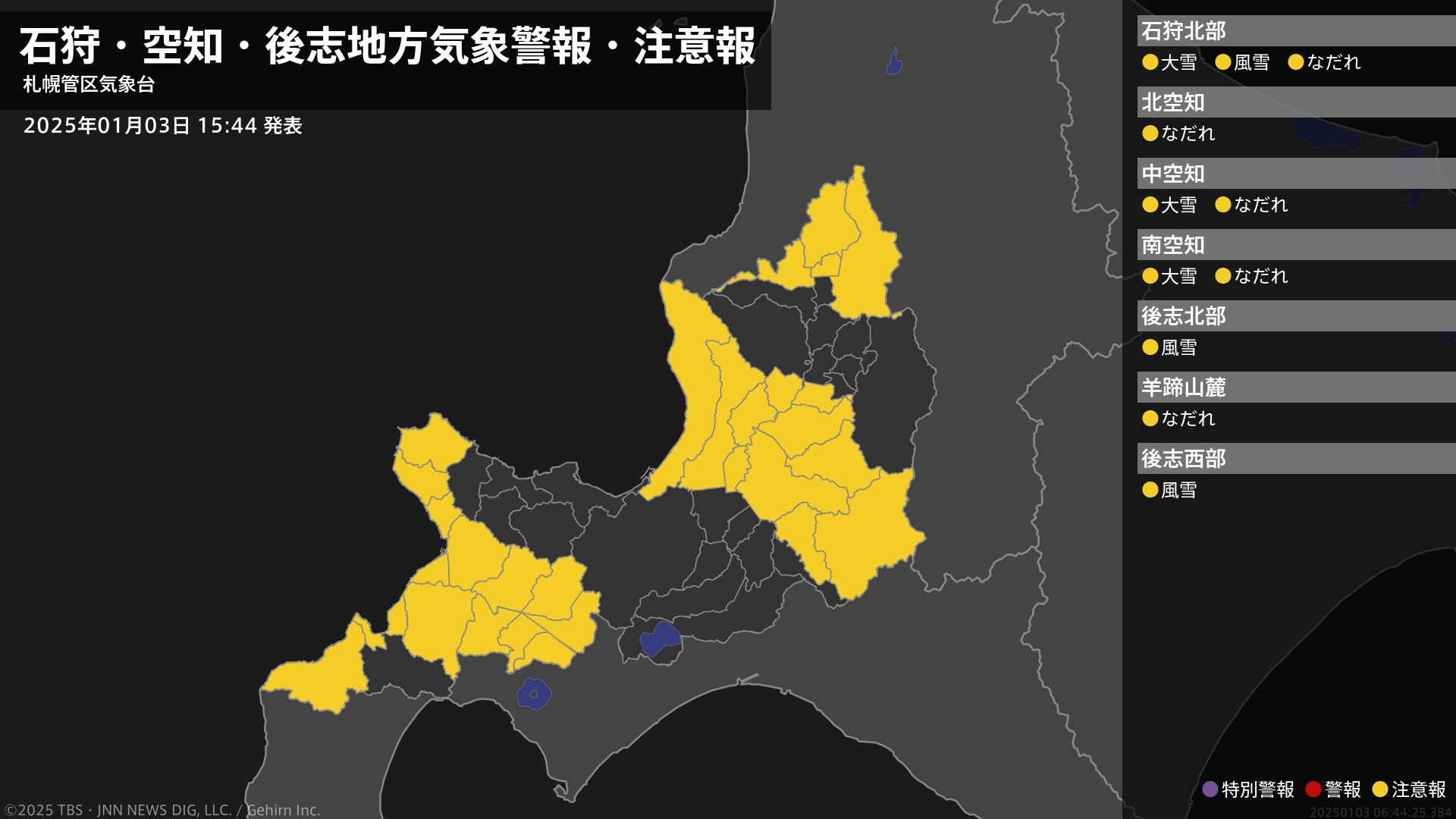 石狩、後志地方では、風雪に注意してください。石狩、空知地方では、大雪に注意してください。石狩、空知、後志地方では、なだれに注意してください。