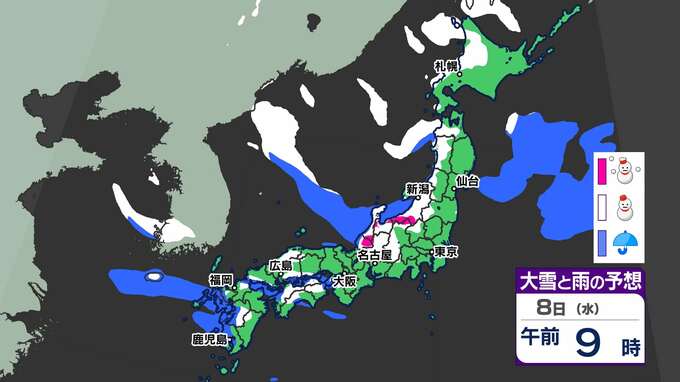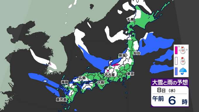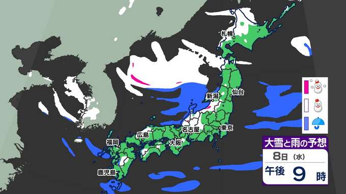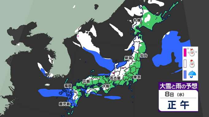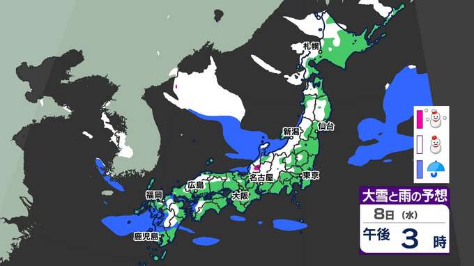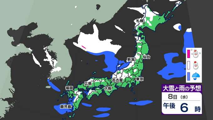 【雪はいつ どこで降る】Uターンへの影響は?/3日(金)~8日(水)雨と雪のシミュレーション 南日本放送 2025年1月3日(金) 19:00 国内 天気 「青」は「雨」/「白」は「雪」/「赤」は「大雪」の予想です