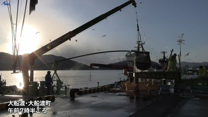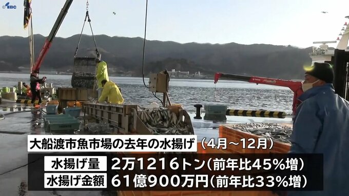大船渡市魚市場の2024年の水揚げ量はカツオの豊漁やサンマ漁の復調などもあり、2万1216トンと前の年から45%増え、水揚げ金額も61億円余りと33%増加しました。市場では早速入札が行われ、浜は活気づいていました。