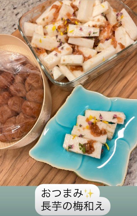 投稿された写真では、美味しそうな長芋のおつまみと、梅干しが卓上に並んでいる様子が見て取れます。