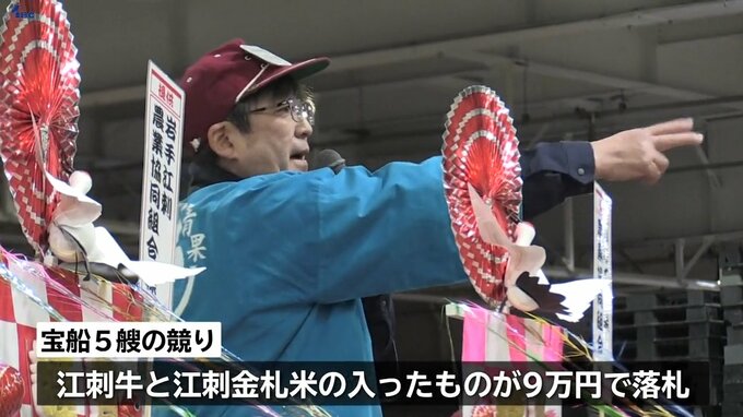 5日は恒例の5艘の宝船の競りが行われ、このうち江刺牛と江刺金札米の入ったものが9万円で落札されました。宝船の売り上げは岩手県社会福祉協議会へ全額寄付されます。
