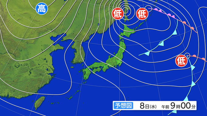 9日(木)は西日本でも上空約1500メートルは-9度以下に 近畿や四国でも“冬日”の週に 日本海側は雪で荒れる天気のおそれ 雪・雨と風シミュレーション 北陸放送 2025年1月6日(月) 14:44 国内 8日(水)ごろから冬型の気圧配置が強まり、上空にも強い寒気が流れ込む見込みです。日本海側を中心に週末にかけて雪が降り、荒れる天気になるおそれがあります。また、寒さが一層厳しさを増しそうです。 8日午前9時の予想天気図です。 8日(水)午前9時の予想天気図 低気圧が北海道へと進み、冬型の気圧配置になる見込みです。9日以降も冬型が続くでしょう。