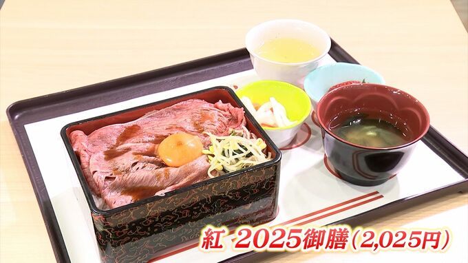 紅は、岡山県産の和牛をオリジナルのタレで味付けした焼きしゃぶ重がメインの2025御膳(2025円)。