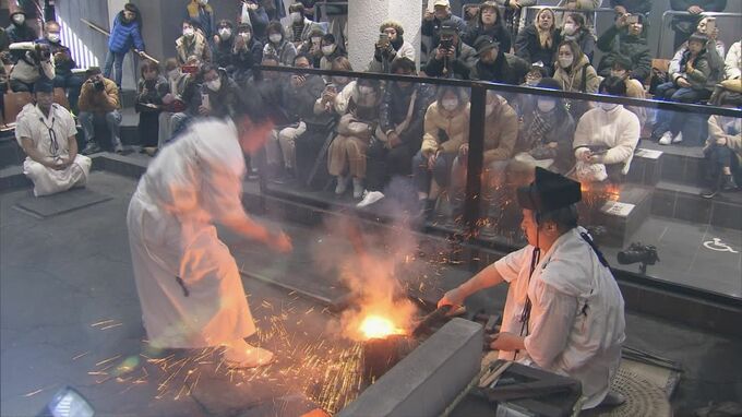 大勢の観光客らが見守る中、烏帽子に白装束姿の刀匠が、昔ながらの方法で火を起こした後、真っ赤に熱せられた玉鋼に大槌を振ると、会場には澄んだ音が響きわたりました。