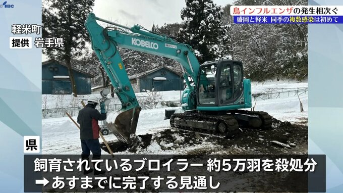 さらに4日には、軽米町の養鶏場でも高病原性の可能性が高い鳥インフルエンザが確認され、県は5日からこの養鶏場で飼育されているブロイラーおよそ5万羽の殺処分を行っていて、7日までに完了する見通しです。
