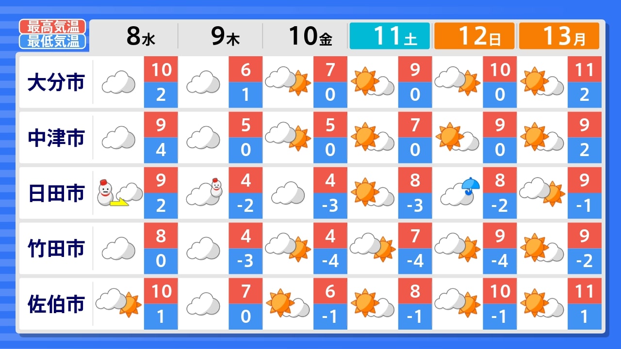 9日(木)を中心に雪が降るでしょう。また、氷点下が予想されている朝も多く、最高気温が5℃以下というところも目立ちます。また、