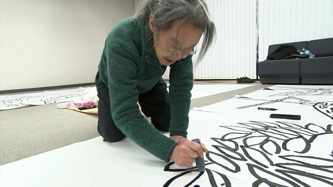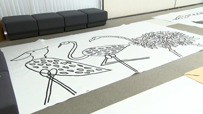 国の内外で活動している坂出市在住のアーティストが、香川県を代表する憧れの画家から着想を得たコラボレーション作品を坂出市の美術館で制作しました。スティックのりのような絵画用のペンを使って、白い紙に動物を描いていきます。