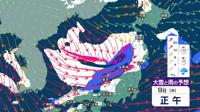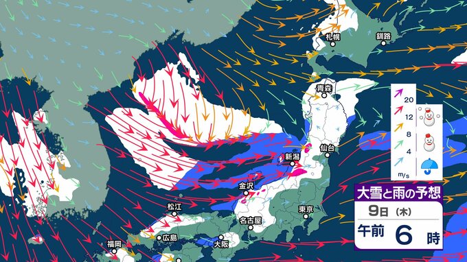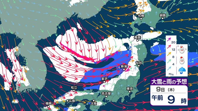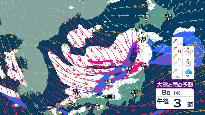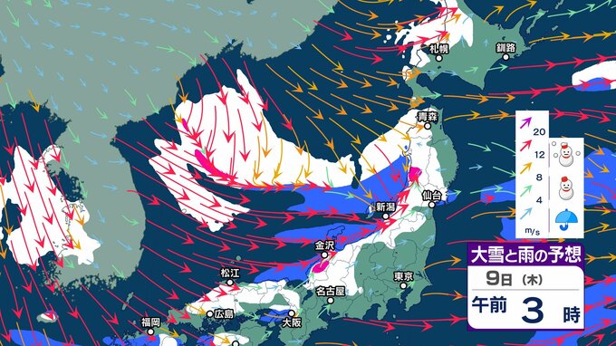 上空5500メートルに氷点下36℃以下の寒気…7日夜から“嵐の使者”が南下【雪と雨のシミュレーション 3時間ごと10日まで】JPCZの強雪帯 北陸を指向…平地でも警報級大雪か チューリップテレビ 2025年1月6日(月) 22:00 国内 天気 9日 雪と雨シミュレーション(3時間ごと)