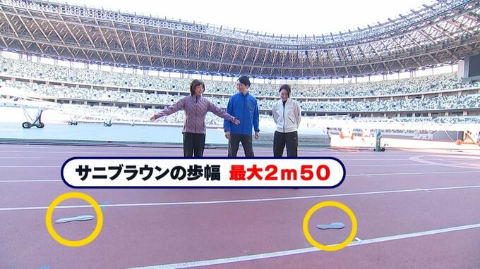 さらに凄さを知るため100mでの歩数にも注目した。小川キャスターは、100mで84歩だったが、世界と戦うサニブラウンは100mを43歩である。さらに驚くべきはサニブラウンの歩幅最大が2m50である事。