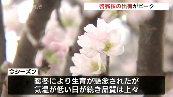 サクラの開花には一定の低温期間が必要で暖冬傾向の今シーズンは生育が心配されましたが、11月中旬から気温が低い日が続いたため品質は上々だということです。