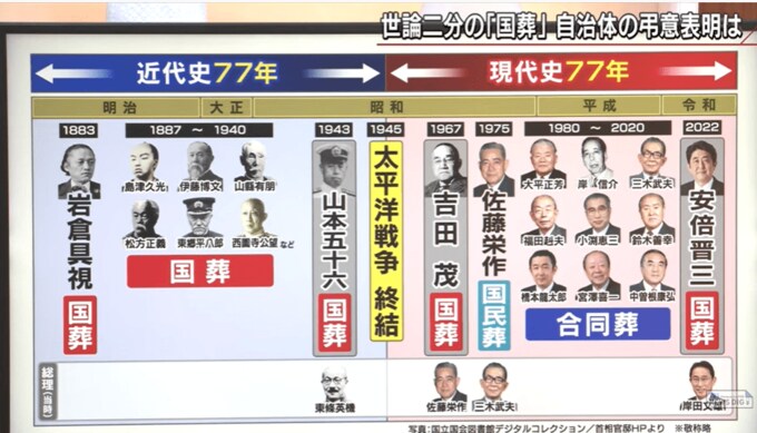 「戦前は国葬令があって皇族は国葬と法律で決まっていたが、それを除いて見てみると…。岩倉具視に始まって、伊藤博文、山縣有朋など明治維新の功労者ですね。それで戦前最後の国葬は山本五十六。明治維新以降の軍事主導体制が、軍事によって終わるわけですが、山本は最後の軍事である太平洋戦争の象徴ですよね。つまり山本五十六の国葬によって近代の歴史的なタームがここで終わるわけです」