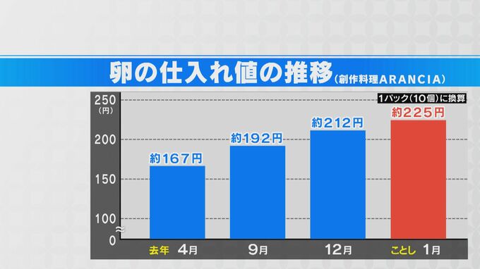 この店の卵の仕入れ値は、卵10個あたり去年4月は167円でしたが、9月に入り192円に。