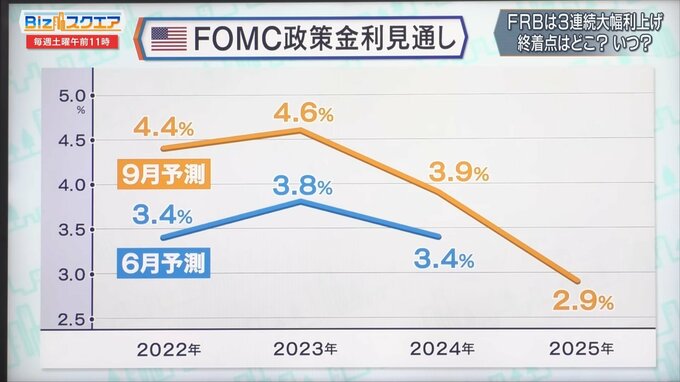 FOMC(連邦公開市場委員会)参加者18人による2022年6月と9月時点の政策金利予測を比べると、6月時点で22年末に3.4%としていたのを、9月には1%も上げて4.4%としている。