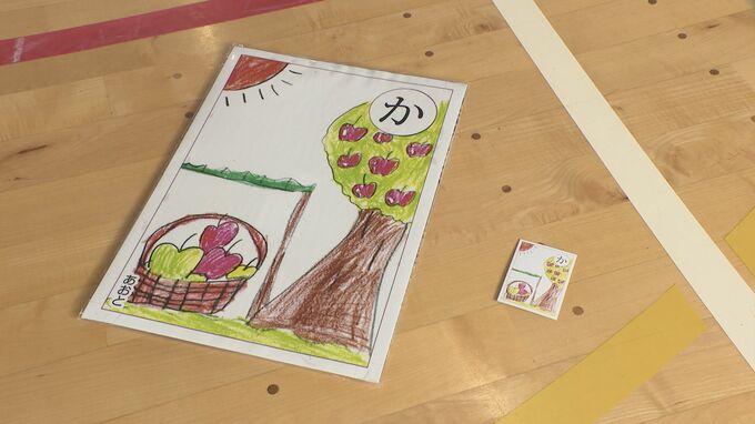 横およそ30センチ、横42センチのA3サイズの絵札は子どもたちが描いたもので、地元を通る国道18号、通称アップルライン周辺のリンゴ栽培や、6年前の台風19号災害に関連したものも。