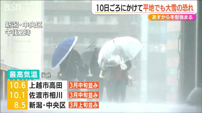 7日の新潟県内は、3月中旬並の暖かさとなったところもありましたが、8日からは一転、冬型の気圧配置が強まり10日ごろにかけて山沿いを中心に、平地でも大雪となる所がありそうです。
