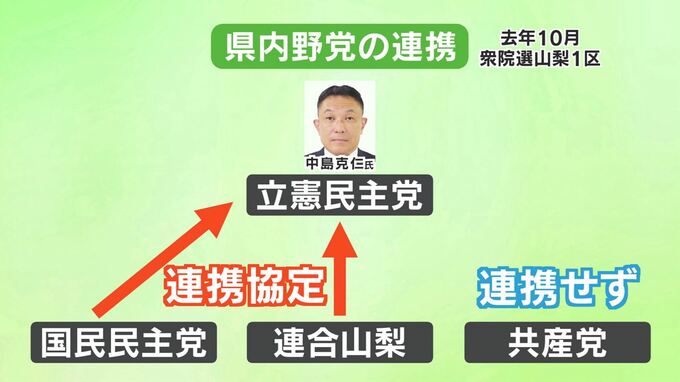 去年10月の衆院選の山梨1区で立憲民主党は候補者の中島克仁さんについて、共産党とは連携しない一方、国民民主党、支持団体の連合山梨とは早い段階から連携協定を結んでいました。