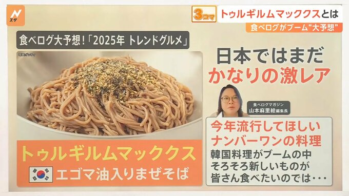 食べログが選ぶ2025年のトレンドグルメは、韓国のエゴマ油入りまぜそば「トゥルギルムマッククス」です。日本ではまだかなりの激レアだそうです。