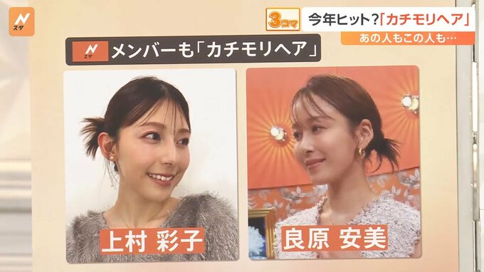 アイドルだけではありません。実は私や上村キャスターもたまにカチモリヘアをしています。ただのお団子ではなく、毛先が出ることでちょっと動きがあって華やかな印象になる感じがします。
