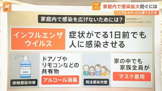 国際医療福祉大学 松本哲哉主任教授によりますと「インフルエンザウイルスは症状がでる1日前でも人に感染させる」といいます。