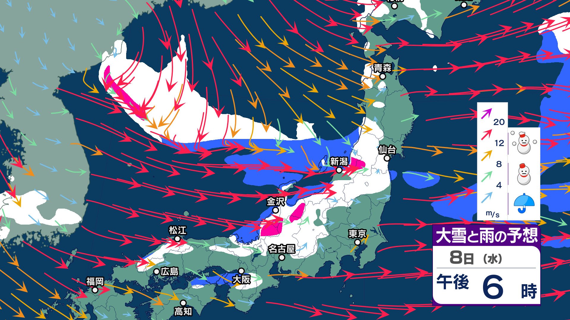 気象庁によりますと、北日本では8日夜から9日にかけて大雪や猛ふぶき、吹きだまりによる交通障害、暴風に警戒してください。また、東日本から西日本では、10日にかけて大雪に注意・警戒してください。東日本と西日本の日本海側では、9日にかけて高波に警戒してください。