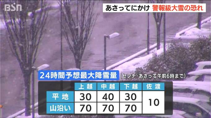さらに9日朝から10日朝までに上・中・下越の山沿いで70cm、中越の平地で40cmの雪が降ると予想されていて、平地でも大雪になる恐れがあります。